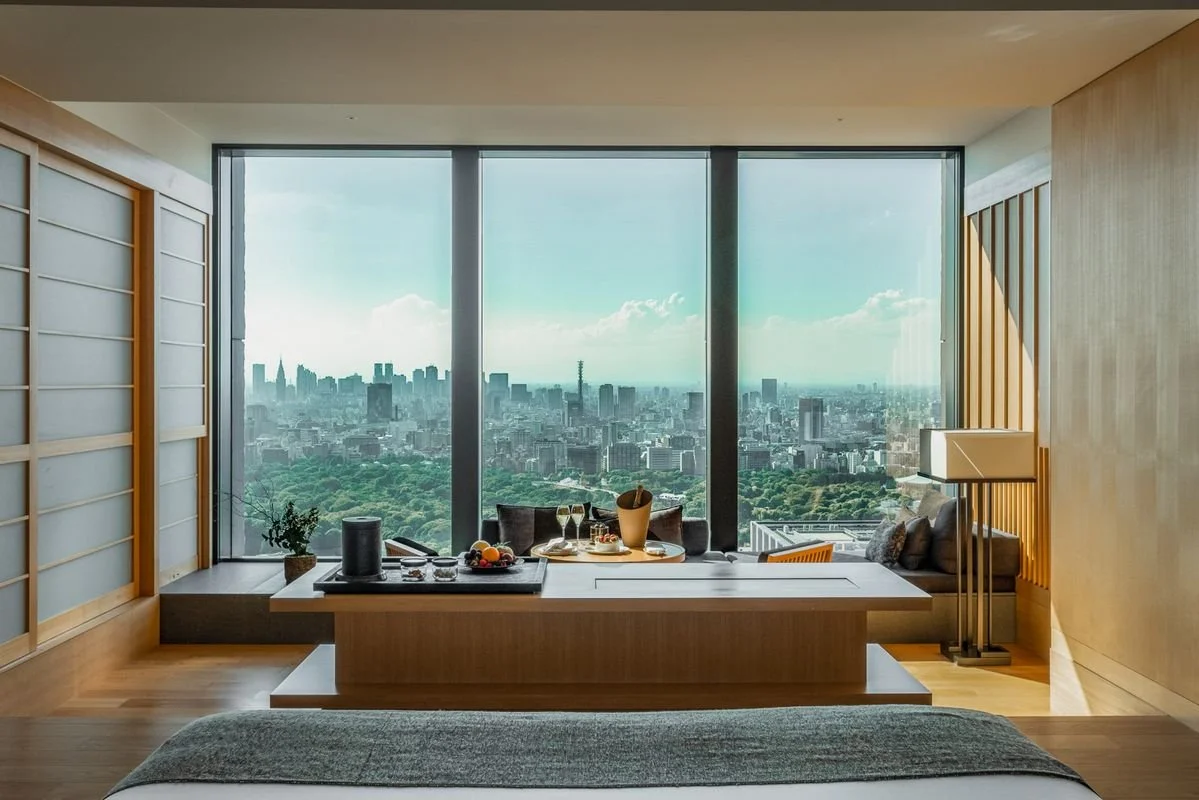 Suspended above the city's pulse, this urban sanctuary distills Japanese minimalism into soaring volumes of light, stone, and silence. Every detail whispers restraint, from the forest-deep onsen to rooms that frame Tokyo as living art.